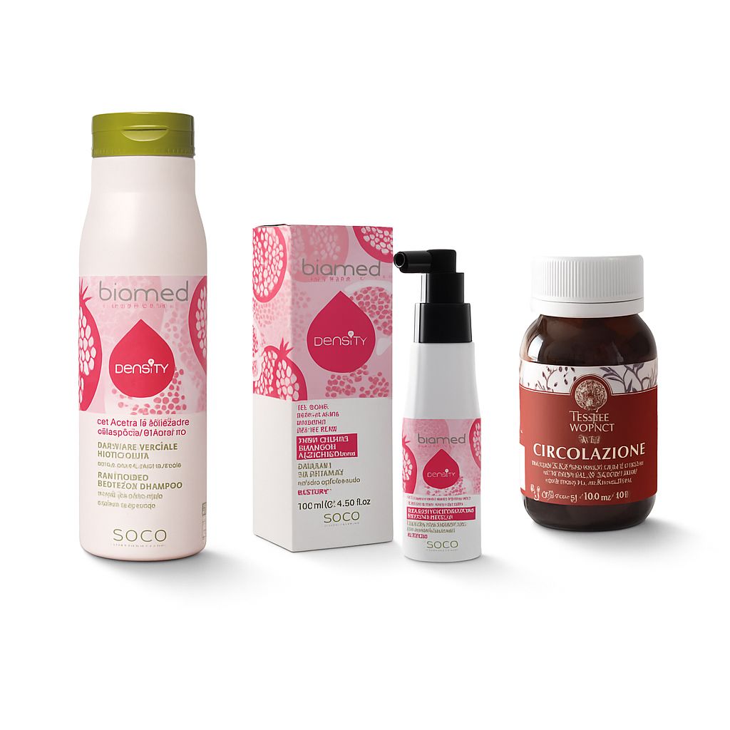 Shampoo vegetale + spray anticaduta + capsule per favorire la microcircolazione sanguigna.